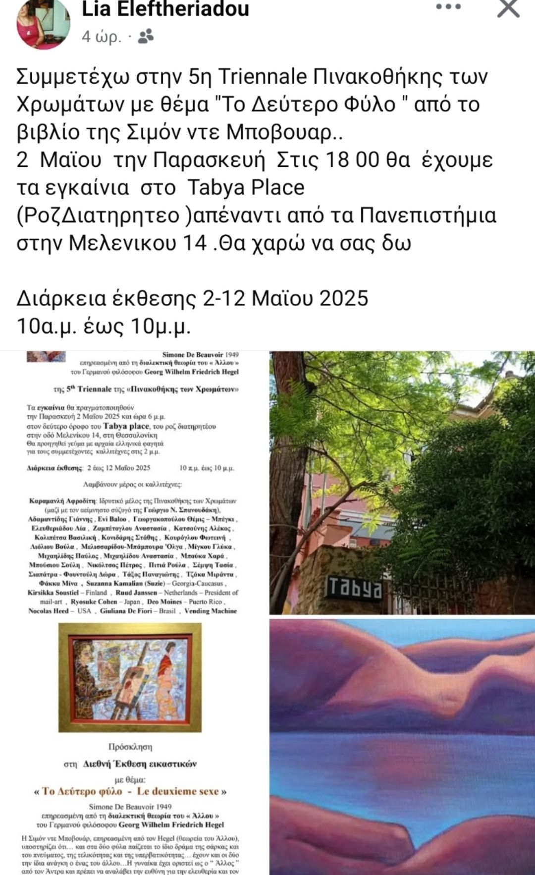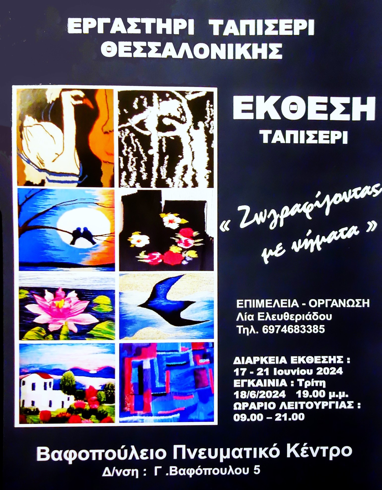 - Ατομική έκθεση Βαφοπούλειο Πνευματικό Κέντρο Δήμου Θεσσαλονίκης, Έκθεση μαθητών ΤΑΠΙΣEΡΙ (ΕΡΓΑΣΤΗΡΙ ΤΑΠΙΣΕΡΙ ΘΕΣΣΑΛΟΝΙΚΗΣ-Facebook)